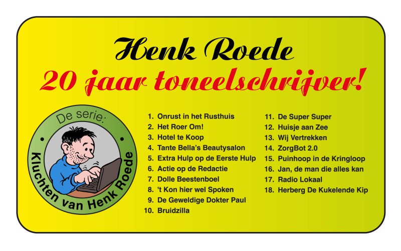 Wij bieden een uitgebreid aanbod aan toneelstukken, toneel scripts, blijspelen, kluchten, komedies, musicals, Friestalige toneelstukken, dialecttoneelstukken en nog vele andere genres. Onze nieuwe toneelstukken vindt u bij NIEUWE OOGST. Verder kunt u de nieuwe en oudere catalogi van onze website downloaden. De beste in toneelland. Wij leveren vrijwel alle toneelstukken en musicals, ook stukken die nog niet op de site van onze toneeluitgeverij staan of welke van andere (toneel)uitgevers zijn. De compleetste in toneelland. Via VRIJE TITEL kunt u deze toneelstukken en/of musicals aan uw bestelling of zichtzending toevoegen.
